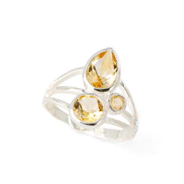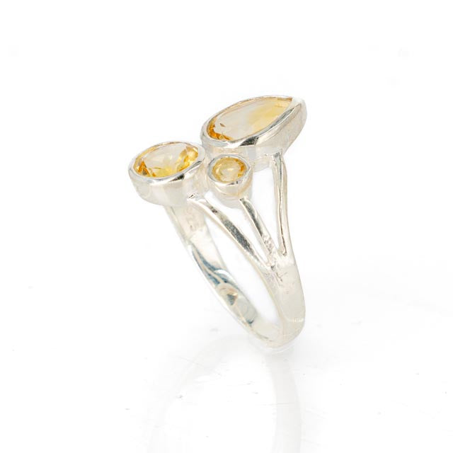 משובצת שלוש אבני סיטרין טבעיות בעיצוב אלגנטי ונקי עם שיבוץ בצורות שונות ליצירת מראה ייחודי ומלא אור. מוסיפה נוכחות חמה ומקפיצה כל לוק בקלות.