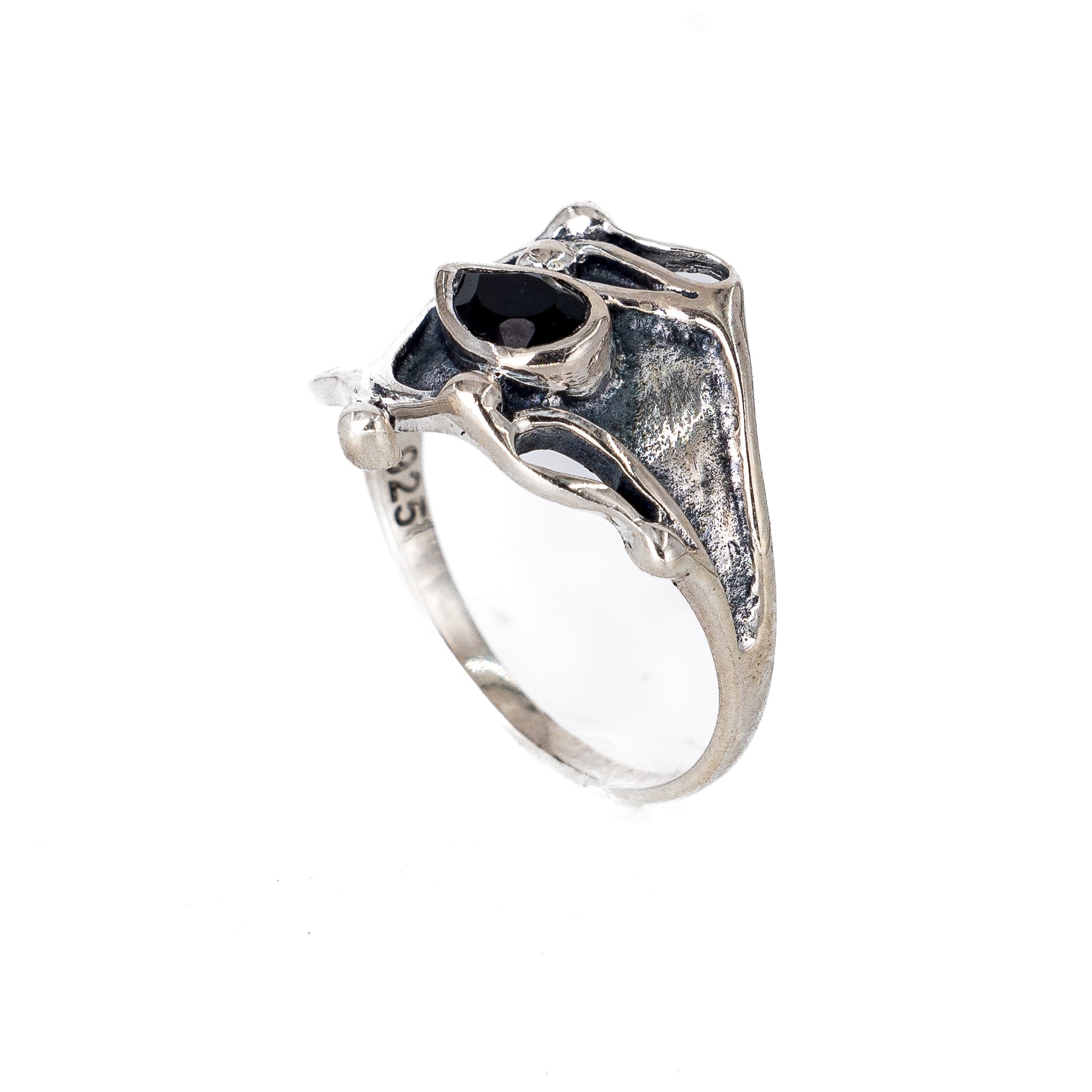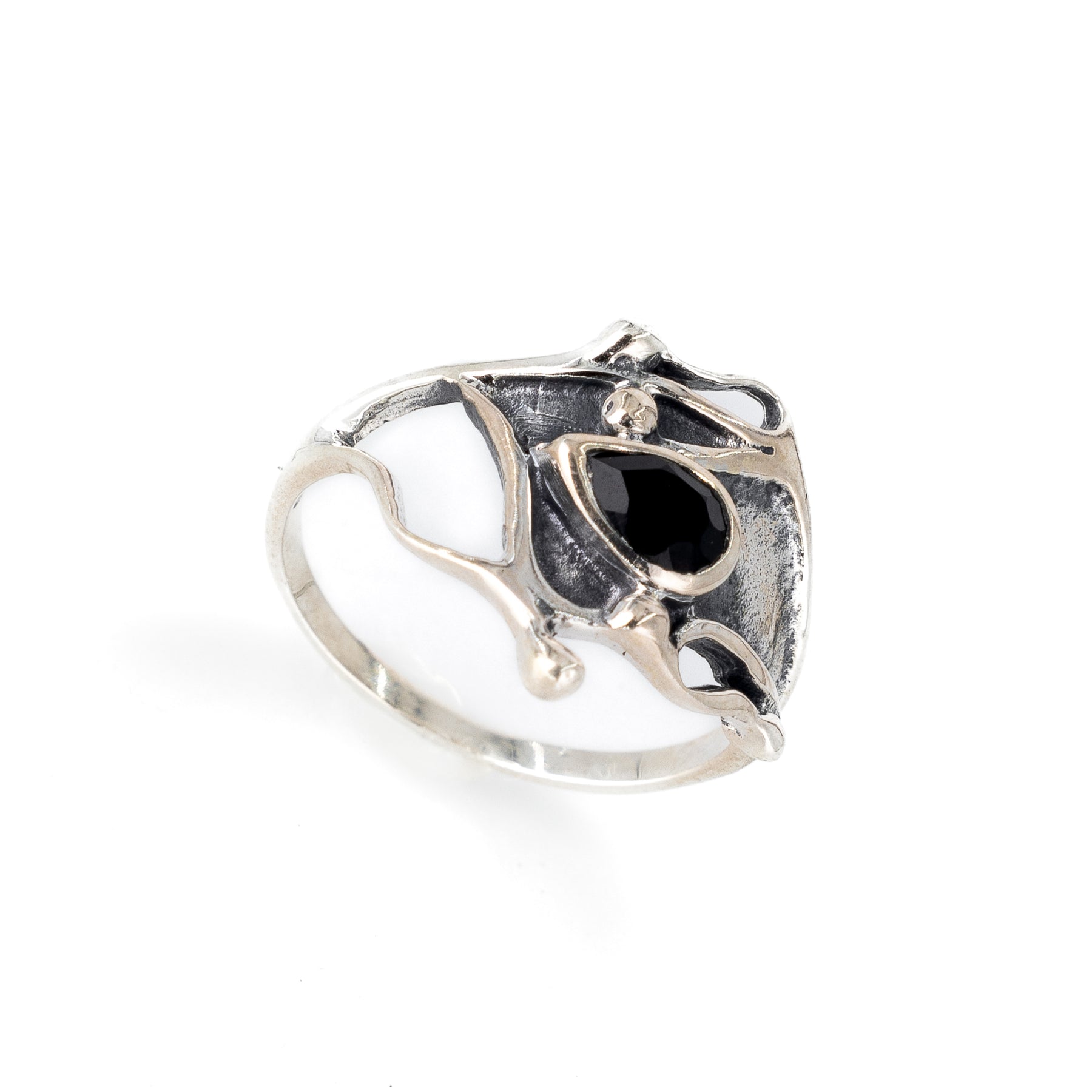 משובצת אבן אוניקס שחורה מלוטשת בצורת טיפה, עוצבה בעיצוב אמורפי ייחודי ומלא בסטייל.